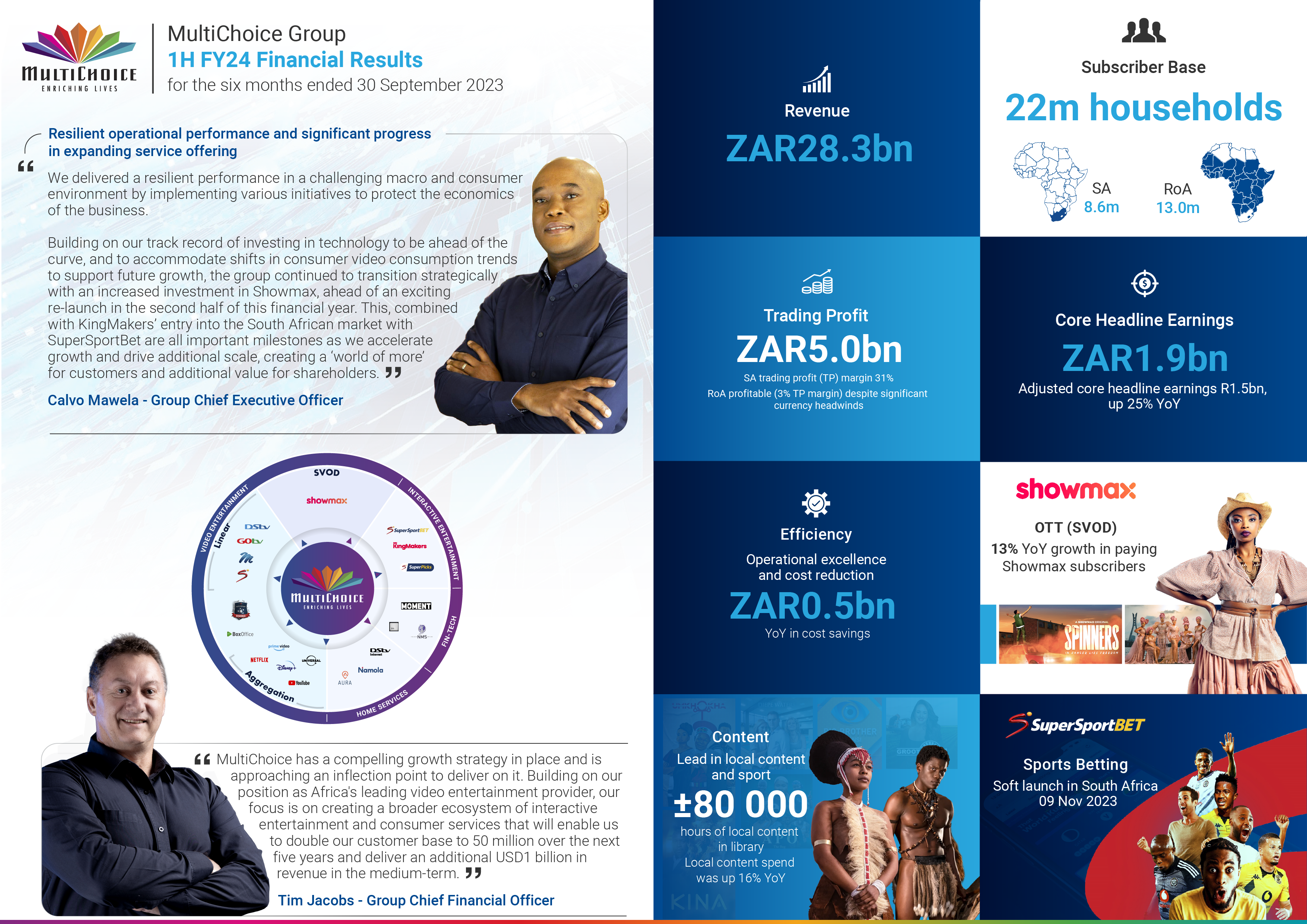 MultiChoice Group (MCG, or the group) (www.MultiChoice.com), Africa’s leading entertainment company, executed well on its operational objectives during the six months ended 30 September 2023 (1H FY24).